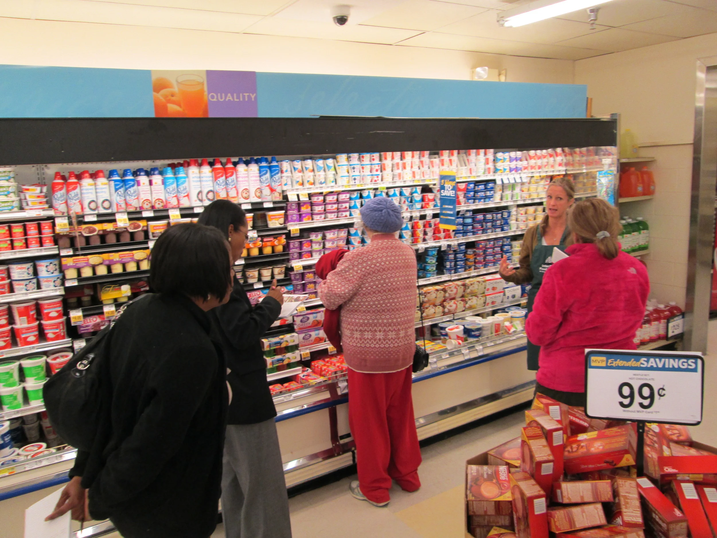 We met at 11:30 at Food Lion and began our tour. We teach economical meal planning from the perspective of trying to fill "My Plate", which demonstrates the five food groups to have at each meal and appropriate food quantity. As we move around the store, we learn helpful tips on buying healthy food on a budget and avoiding marketing or advertising tricks: